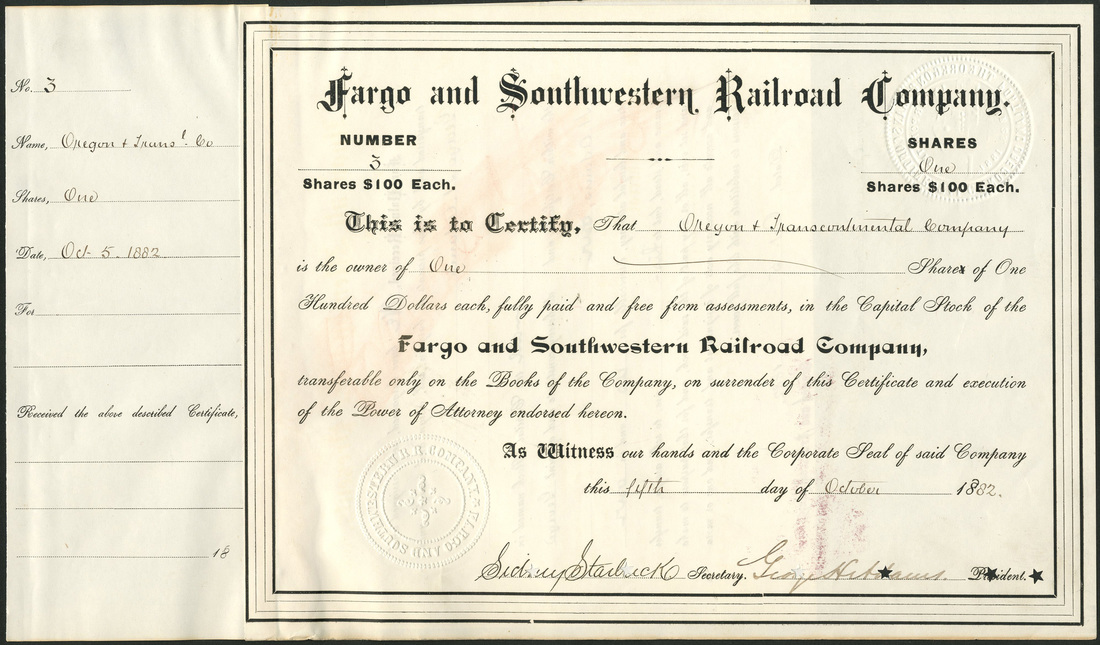Fargo and Southwestern Railroad Co., $100 shares, 18[82], #3, black printing, embossed seal, punch cancelled through signatures, counterfoil reglued at left, AEF