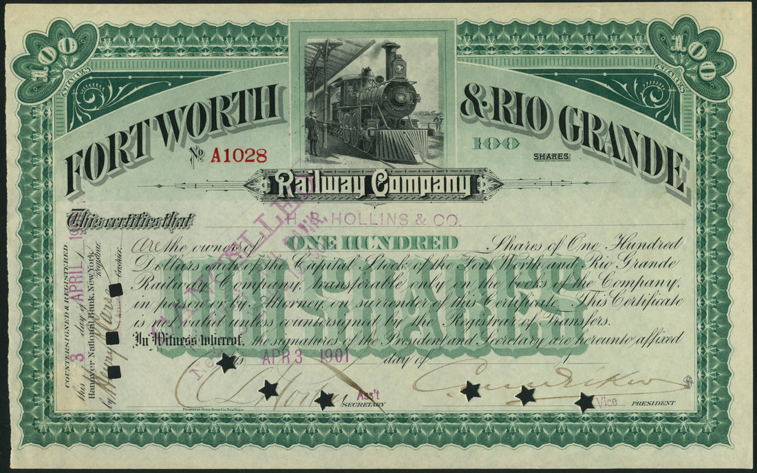 Fort Worth & Rio Grande Railway Company, 100 shares of $100 each, 1[901], #A1028, steam train at station top centre, beautiful border, green and black, hole punch and stamped cancelled, EF