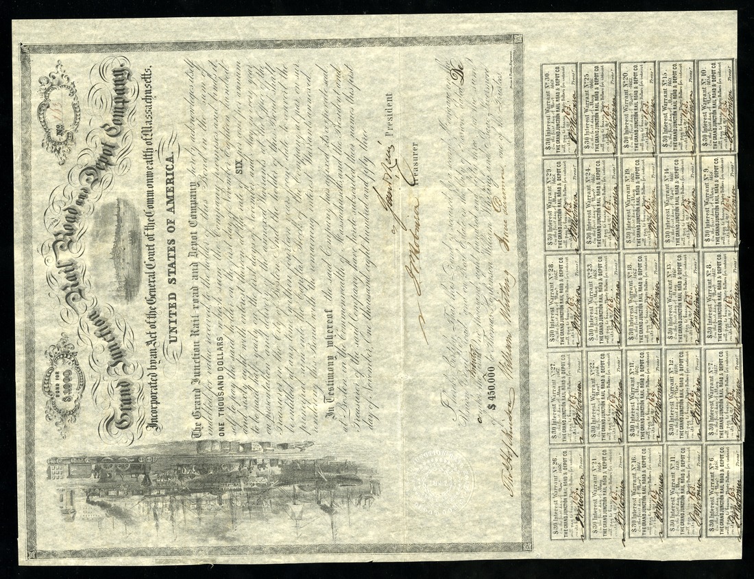 Grand Junction Rail Road and Depot Company, (MA), $1000 bond at 6% interest, 1853, No. 163, lovely engravings of seaports, IU, 25 coupons, VF+.