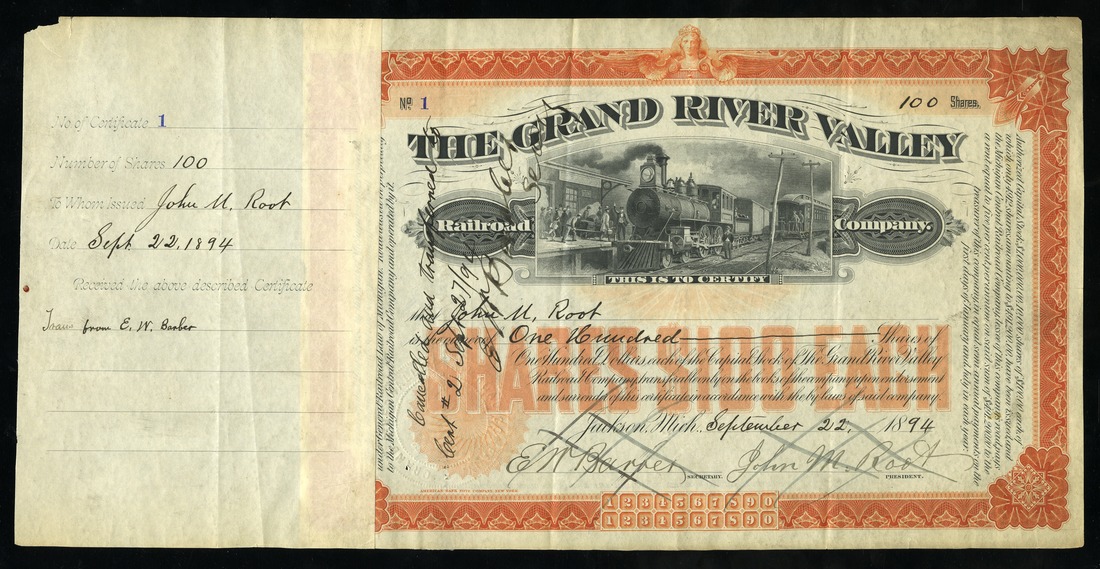 Grand River Valley Railroad Company, (MI). $100 shares, No. 1, red frame, train at station, serial No.1, IC, issued to John M. Root, and signed by him as President, stub lightly pasted over the left border, VF+.