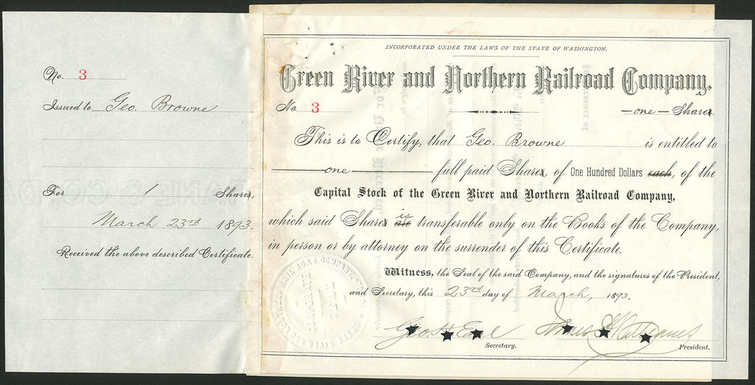 Green River and Northern Railroad Company (WA), $100 shares, 18[93], #3, signed by George H. Earl as secretary, company title in ornate font at top, black embossed seal, transfer attached on reverse, counterfoil re-glued at left, hole punched cancelled, EF