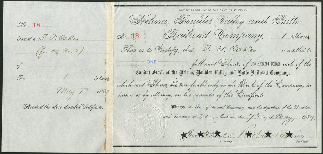 Helena, Boulder Valley and Butte Railroad Co. (MT), $100 shares, Helena Montana 18[89], #18, issued to T. F. Oakes and signed by him on the reverse, also signed by Geo. H. Earl twice as secretary, black printing, embossed seal, punch cancelled, counterfoil re-glued at left, AEF