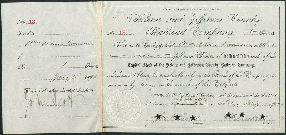 Helena and Jefferson County Railroad Co. (MT), $100 shares, New York City 18[95], #13, signed by Geo. H. Earl as secretary, black, embossed seal at bottom left, punch cancelled, counterfoil re-glued at left, pin holes at top left, otherwise AEF.