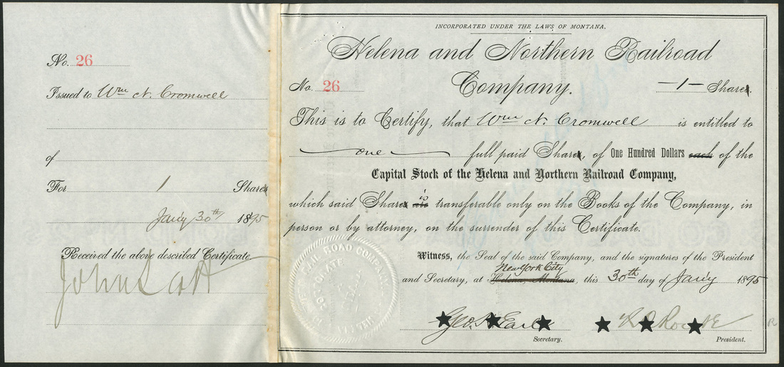 Helena and Northern Railroad Co. (MT), $100 shares, New York City 18[95], #26, signed by Geo. H. Earl as secretary, black, embossed seal at bottom left, punch cancelled, counterfoil re-glued at left, pin holes at top left, otherwise AEF.