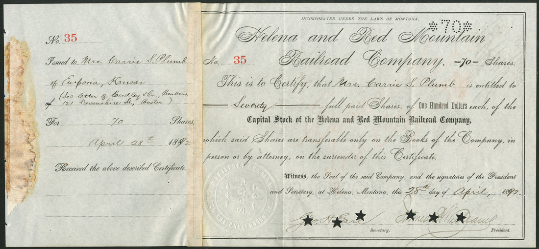 Helena and Red Mountain Railroad Co. (MT), $100 shares, Helena 18[92], #35, signed by Geo. H. Earle as secretary, black, embossed seal at bottom left, punch cancelled, counterfoil re-glued at left, GVF