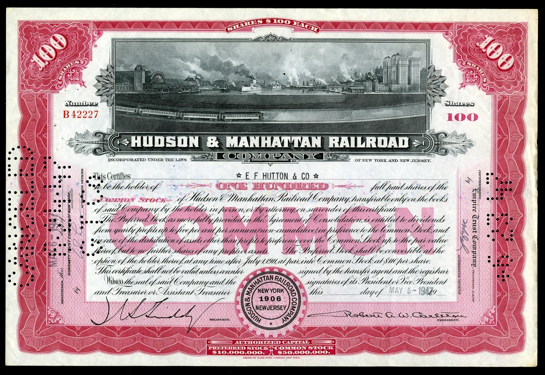 Hudson & Manhattan Railroad (NY), $100 shares, 1940s, trains in tunnel beneath the Hudson River and the Great White Fleet, ABNC, four different colors, IC, [8] all VF+.
