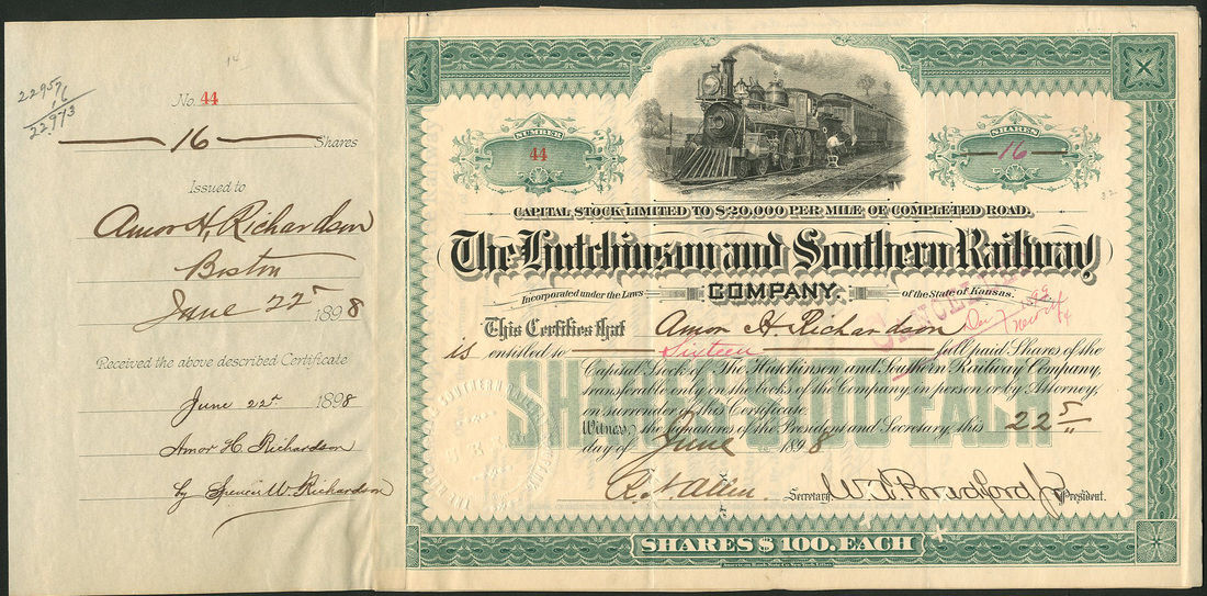 Hutchinson and Southern Railway Company (KS), $100 shares, 189[8], n#44, vignette of steam train top centre, stamped and hole punch cancelled, correspondence regarding power of attorney attached, counterfoil re-glued at left, VF