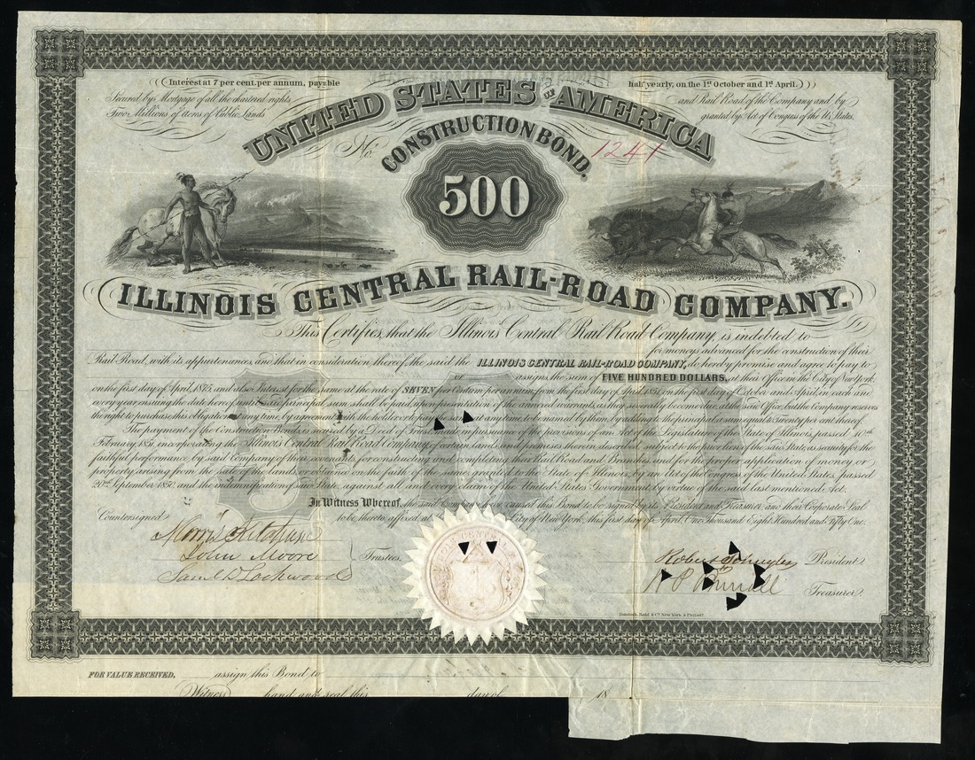 Illinois Central Rail-Road Company, (IL), $500, 7% interest, 1851, No. 1241, signed by Robert Schuyler, Indian with spear and horse watches train, Indian on horseback hunts buffalo, Danforth, Bald, IC, VF+, and above average for this issue.