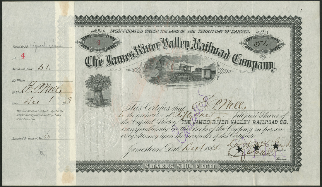 James River Valley Railroad Co. (ND), $100 shares, Jamestown, Dakota 188[3], #4, steam train under title, bundle of wheat at left, ornate border, black, punch cancelled and hand-written on face, counterfoil reglued at left, GVF.