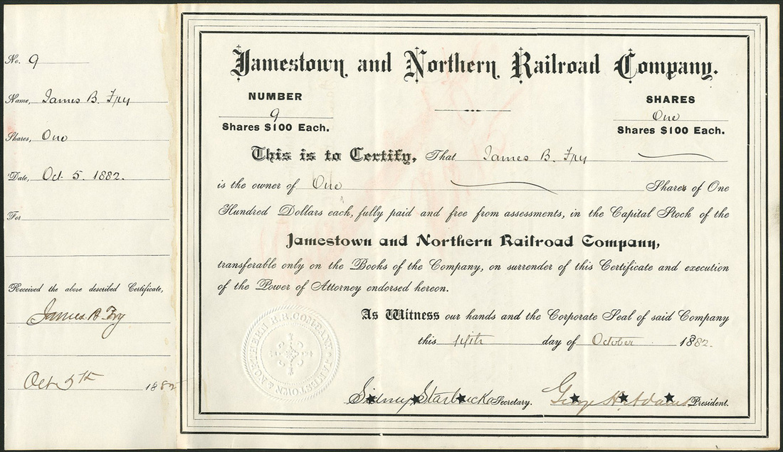 Jamestown and Northern Railroad Co. (ND), $100 shares, 18[82], #9, decorative title and border, black printing, embossed seal, punch cancelled through signatures, counterfoil re-glued at left,GVF and scarce