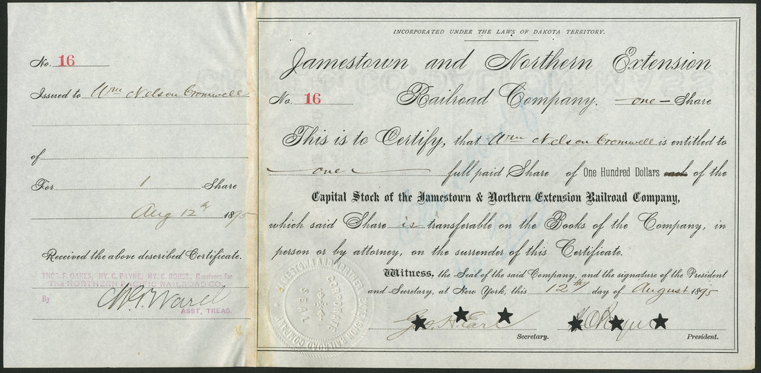 Jamestown and Northern Extension Railroad Co. (ND), $100 shares, New York 18[95], #16, signed by Geo. H. Earle as secretary, simple black printing, embossed seal at bottom left, punch cancelled, counterfoil re-glued at left, AEF