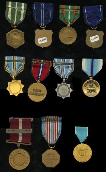 U.S. Coast Guard Medals. Type display group - Good Conduct with Fishers Island bar and ribbon-bar; Distinguished Service with ribbon bar; For Heroism with ribbon bar; Commendation, Achievement, Expert Pistol Shot, Rifleman Expert, Reserves, Arctic Service, Outstanding Service, Meritorious Public Service and Distinguished Public Service. All unnamed, not numbered, some marked display. All on ribbons. Extremely Fine-Uncirculated. Ex Evans Kerrigan Collection. (11)
