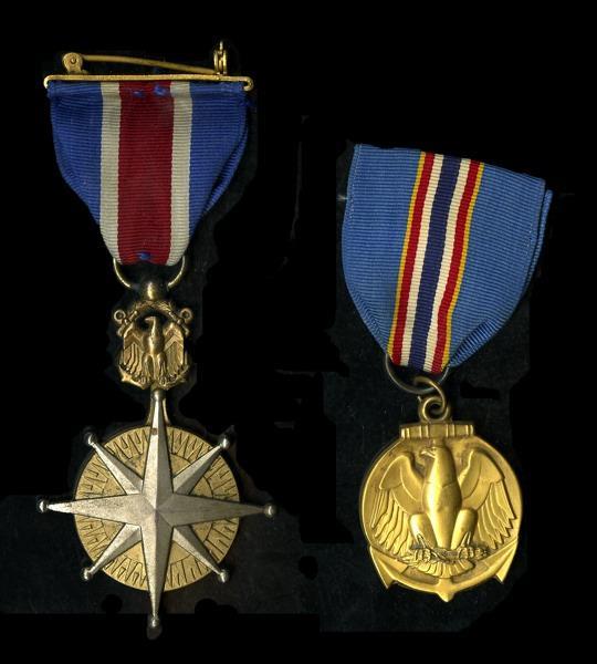 U.S. Merchant Marines Pair: Distinguished Service Medal. Post WWII. With ribbon bar and lapel miniature. Reverse somewhat unevenly toned. Scarce; and Meritorious Service Medal. No. 1468. With ribbon bar. Both on ribbons. Extremely Fine. Ex Evans Kerrigan Collection.