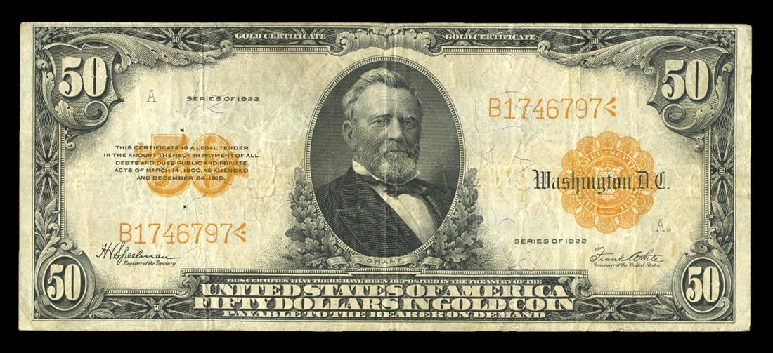 Fr. 1200. $50. 1922 Gold Certificate. Ulysses S. Grant. Speelman-White. No. B1746797 A. Very Fine, pinholes.