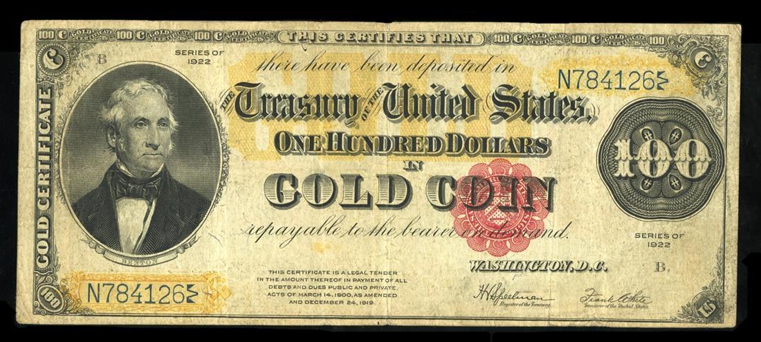 Fr. 1215. $100. 1922 Gold Certificate. Thomas Hart Benton. Speelman-Benton. N784126 B. Heavy center fold, edge splits, otherwise Very Fine with nice color.