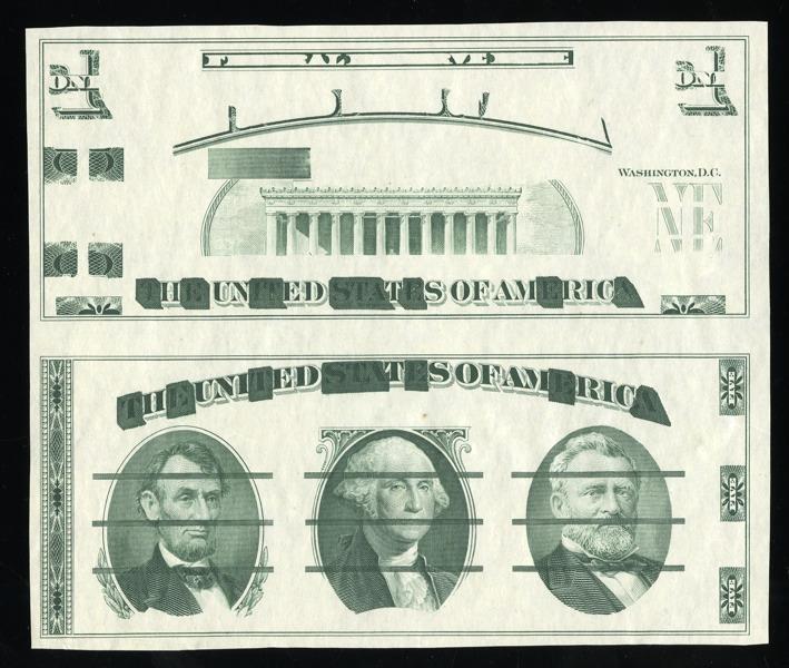 Giori Press Test Note. Uncut Pair. Memorial, One Dollar bill elements top, Lincoln, Washington, Grant vignettes bottom. Uncirculated, with some internal paper wrinkles.