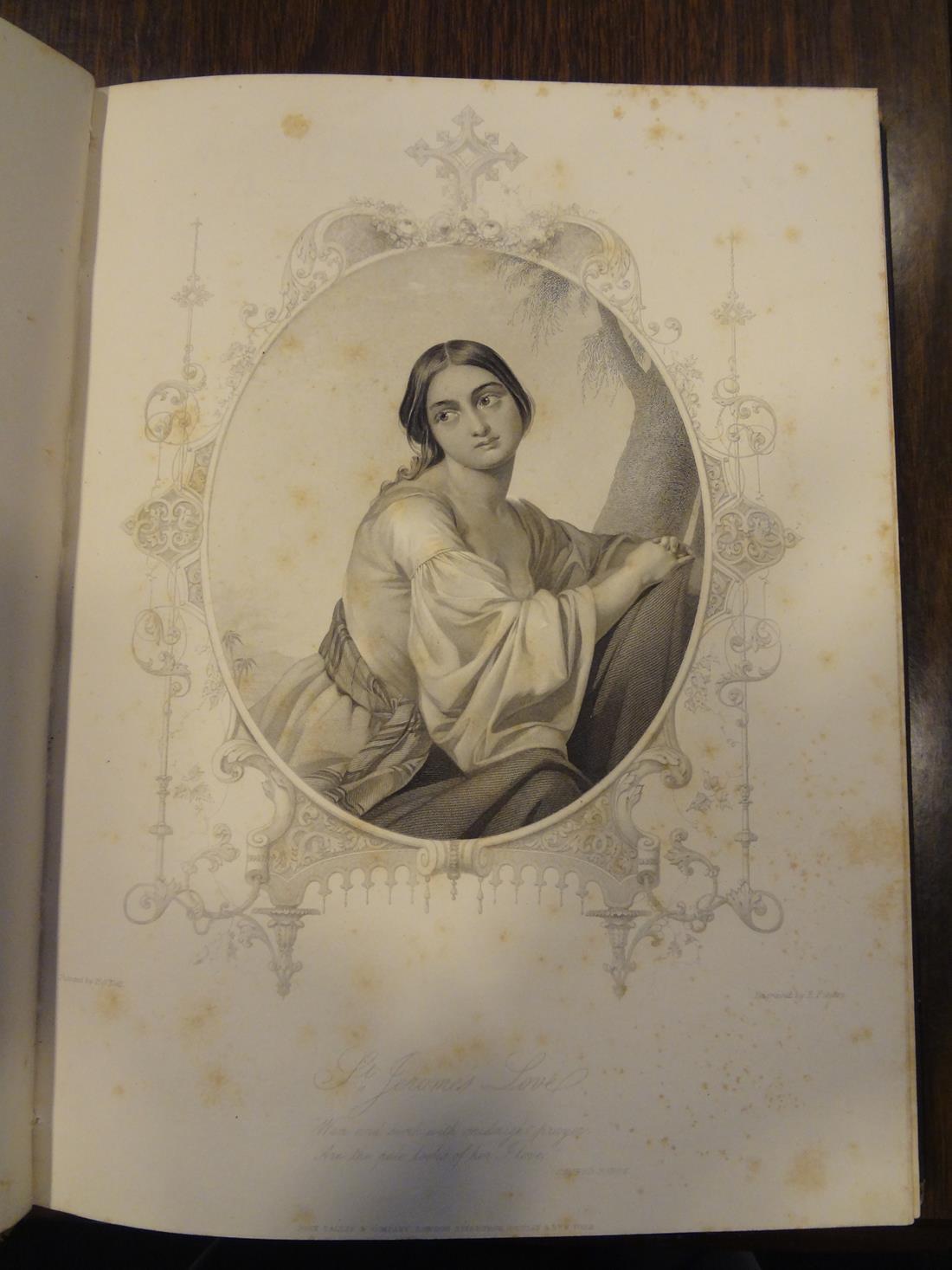 Large quarto, dark green cloth board covers, black board with green tips and gold-letter titled spine. Ex-libris "George W. Casilear." CA 1870s. 59 pages. Engravings by Lecomte; J. Horsburgh; C. W. Sharpe; R. Graves and others. Subjects include Fame; The Day-Dream; The Huntress; Sappho; The Woodman and others. Many semi-nude allegories. Many are large format engravings. For the most part pages are in very fine condition, but there is minor age toning on several examples.