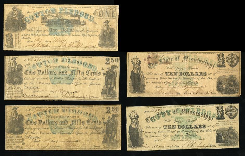 MS. Civil War issues. State of Mississippi. Quintet of 1862 "Cotton Pledged" notes: 1) $1, May. Fine; 2-3) $2.50, May. VG-F and Fine with pinhole; $10, April and May. VG-F, stain, F-VF, single staplehole. [5]