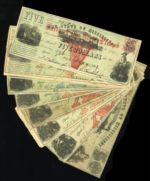 MS. Civil War issues. State of Mississippi. Septet of 1862 "Faith of the State Pledged" notes: 1-2) $5. July and Nov. Red o/p; VG, About VF with pinhole; 3-4) $10. Blue o/p. May and Nov. Fine; 5-8) $10. Red o/p. July and Nov. VG-Fine+, one with staplehole; 9) $50. Nov. About Fine, body hole, missing bottom corner tips. [9]