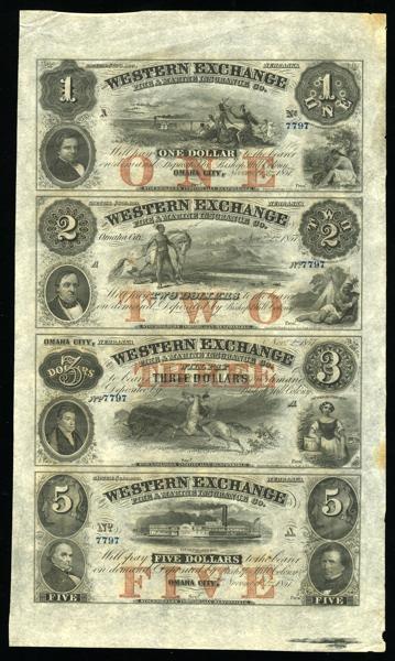 NE. Omaha. Western Exchange Fire & Marine Insurance Co. Uncut sheet of $1, $2, $3 and $5 Dollars. 1857. Certificates of Deposit. No. 7797. Attractive central vignettes - Indian warriors and family watching locomotive, Indian warrior standing by his horse, Indian hunting bison from horseback, paddleboat. VF-EF.