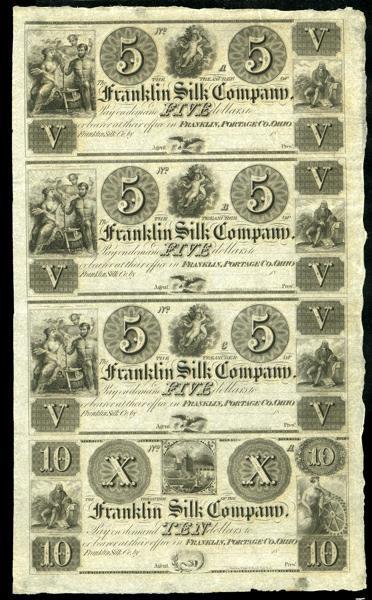OH. Franklin. Franklin Silk Company. Uncut sheet of 3 x $5, and $10. 18--. Allegorical scene of Hephaistos, Mercury and Demeter at left, Ben Franklin at right on $5; Franklin left, bare-breasted Commerce reclining on gear at right on $10. VF-EF.
