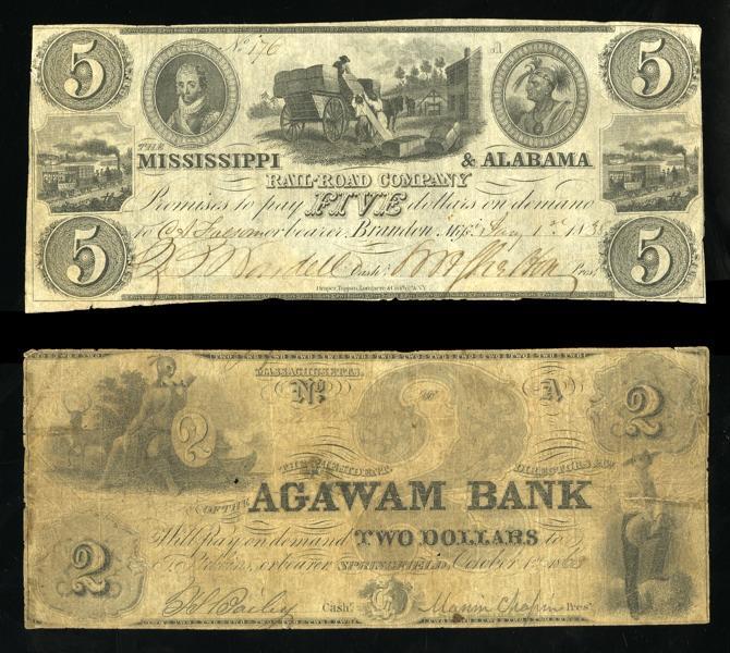 Obsolete pair: MA. Springfield. Agawam Bank. 1) $2, 1863. VG, some pinholes; MS. Brandon. Mississippi & Alabama Railroad Co. 2) $5, 1838. Cameos of De Soto and Indian chief flank wagon loading scene. VF-EF, somewhat uneven bottom margin. [2]