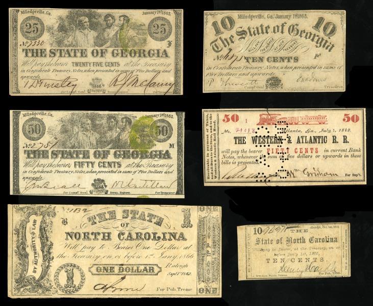GA and NC. Peach Tree State and North Carolina lot. Atlanta. Western & Atlantic R.R. 1) 50 Cents, 1862 (punch canceled); State of Georgia. Civil War issues: 2) 10 Cents, 1863, 3) 25 Cents, 1863, 4) 50 Cents, 1863; State of North Carolina: 5) 10 Cents, 1861 (pinhole); 6) $1, 1862. On average About VF-VF. [6]