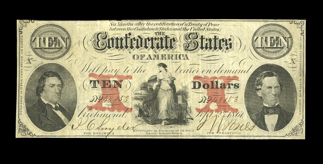 Cr.177. PF-8. No.48153. X. Hope with anchor, Hunter and Memminger. Red solid lace X overprint, flourish over "bearer," "of" before "the." "CSA" script watermark. VF, with nearly full margins. There is a light pencil notation on the back, mentioned merely for the sake of accuracy.