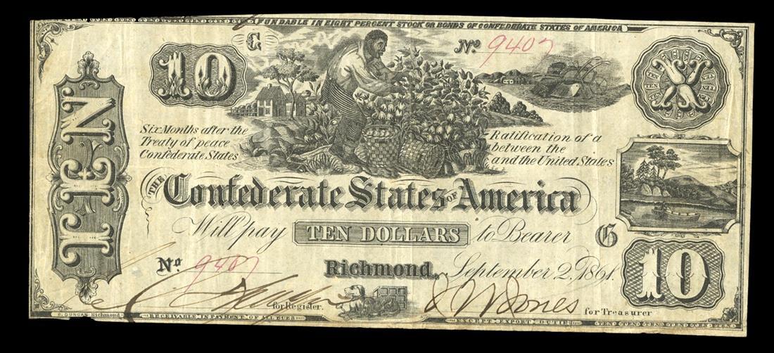 Cr.237 PF-1. No.9407. C. Slave picking cotton. Very Fine, with a few minor pinholes. There is a minor thin spot in the paper, as made, and barely discernable. The printing is bold and sharp impression. Very difficult to obtain this nice.