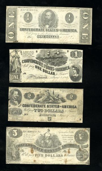 CSA. An assortment and miscellaneous: T-36. $5 1861. Fine, stains; T-42. $2 1862 (2). Both VG; T-44. $1 1862 (2). Both About Fine; T-55. $1 1862 (2). VG, stain and AG; T-61. $2 1863. VG; T-68. $10 1864 (3). VF, tear; Fine, stains; Fair; T-69. $5 1864. VG; T-70. $2 1864. VG, stains; also included are two low-grade Mississippi obsoletes, two small size $1 Silver Certificates; two pieces of Fractional Currency, a Lincoln Columbian Expo ticket and three stamp-related items. [23]