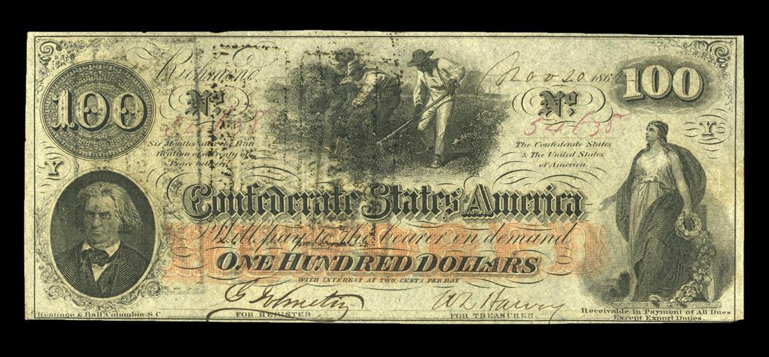 No.54636. Y. CSA block vertical watermark. Negroes hoeing cotton. Red-brown overprint. Savanna and Jackson interest stamps. Uncirculated, but some teller handling and bleed through from the interest stamps.