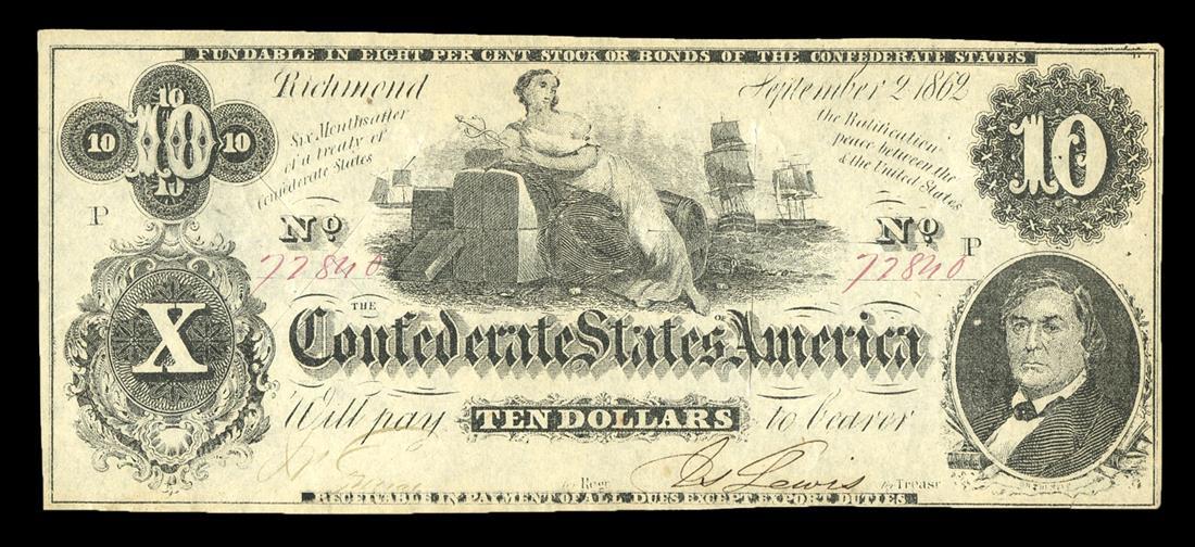 Cr.343. PF-2. No.72840. P. Ceres and cotton, ships beyond. R. M. T. Hunter. Uncirculated, with full margins. Neatly cut cancelled. A very pleasing example.