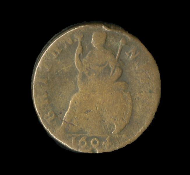 Great Britain. William and Mary (1688-1694). Farthing, 1694. Full Reverse Brockage. Britannia seated l. S.3453, KM 466.2. Good and rare. Ex Colin Cooke Collection.