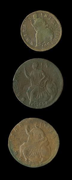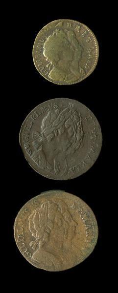 Great Britain. William and Mary (1688-1694). Trio of AE mint errors. Halfpennies, 1694 (2) - Double struck-rotated. Legends doubling, shift. Date "169 1694" profiles shift. Dark olive-brown, About Very Fine; Double struck, legends, date. Partial second date "94" diagonally. Granular surfaces, evidence of deteriorating dies. About Fine. S.3452, KM 475.3; Farthing, 1694. Double struck, legends, partial flip-over. "GVLILEMVS" repeated on reverse in to date. S.3453, KM 466.2. Scratches or adjustment on obverse, once wiped. Very Good. (3)