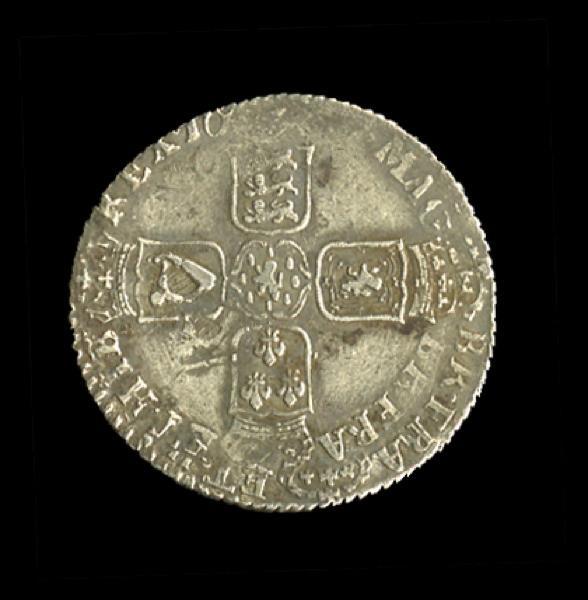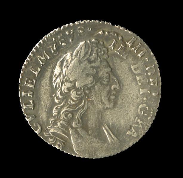 Great Britain. William III (1694-1702). Shilling, 16(9)7. Double struck, second strike 10% off center. First draped bust r., rev. Crowned cruciform Arms, lion at center. S.3497. Last digit in date weak but discernible. Hairlines from old brushing. Very Fine.