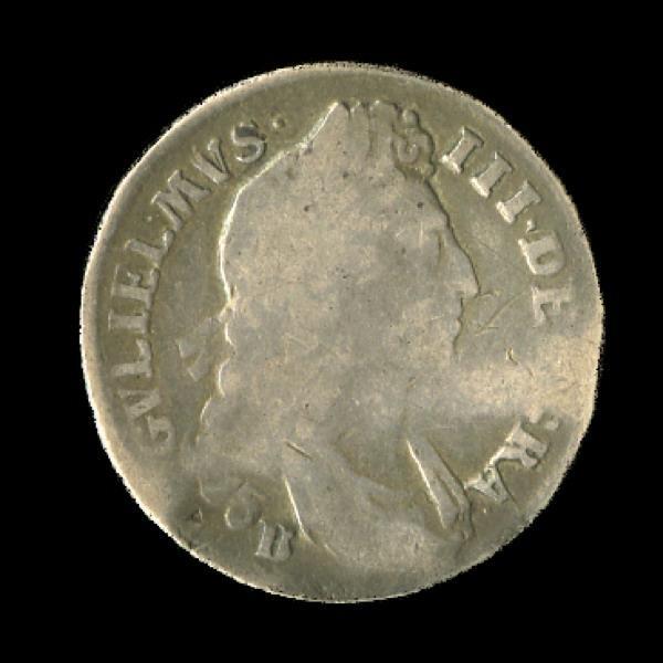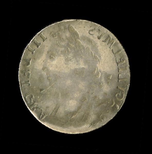 Great Britain. William III (1694-1702). Shilling, (1696-1697) B. Bristol. Full Obverse Brockage. With incuse image spread. First draped bust r., "B" below. S.3498, KM 485.2. Some obverse pinscratches. About Very Good.