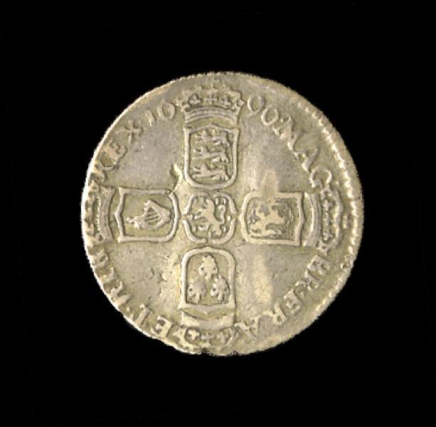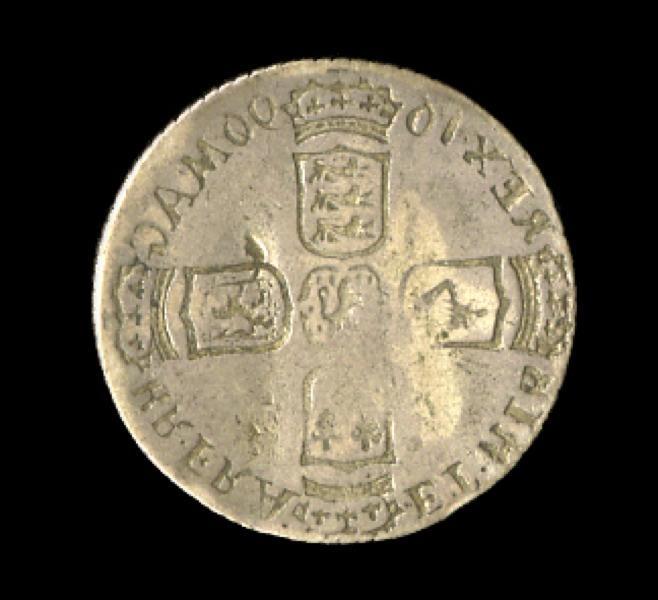 Great Britain. William III (1694-1702). 6 Pence, 1696. Full Reverse Brockage. Crowned cruciform Arms, lion at center. S.3520, KM 484.1. Once bent, has been straightened, small dig near center. Pale purple gray. Very Fine and rare.