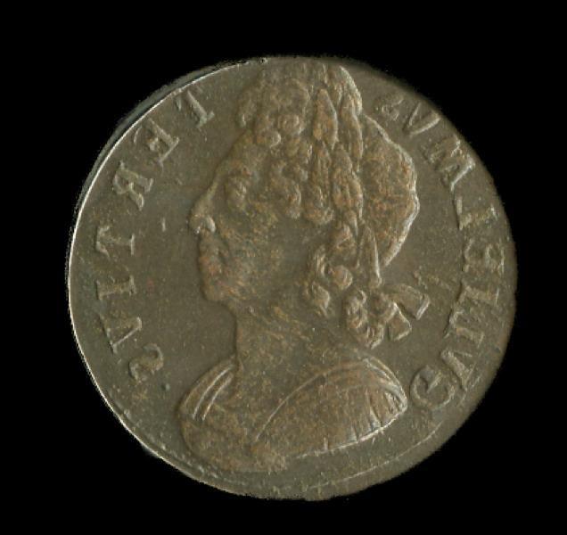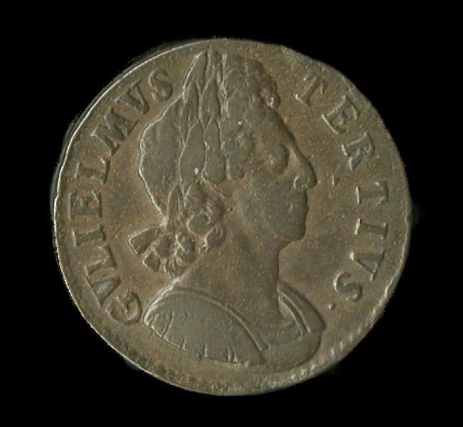 Great Britain. William III (1694-1702). Halfpenny, (1699-1701). Full Obverse Brockage. Laureate and cuirassed bust r. S.3556, KM 503. Some surface pitting, possibly die rust. About Very Fine.