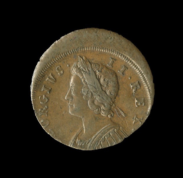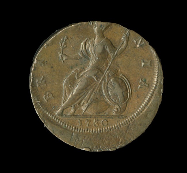 Great Britain. George II (1727-1760). Halfpenny, 1730. Off center, 15%. Young laureate and cuirassed bust l., rev. Britannia seated l. S.3717, KM 566. A few tiny surface pecks. Dark café au lait. Extremely Fine.