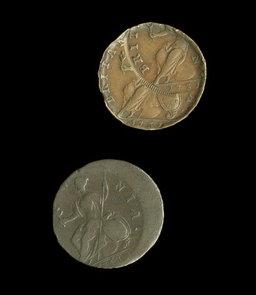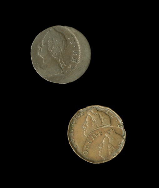 Great Britain. George II (1727-1760). Pair of Halfpenny mint errors: 1731. Double struck, with the second strike 50% off center. A dramatic error with two dates. Young laureate and cuirassed bust l., rev. Britannia seated l. S.3717, KM 566. Edges have been hammered. About Very Fine/Very Fine; 1753. Off Center, 20%. Old laureate and cuirassed bust l. S.3719, KM 579.2. Nice even Fine. (2)