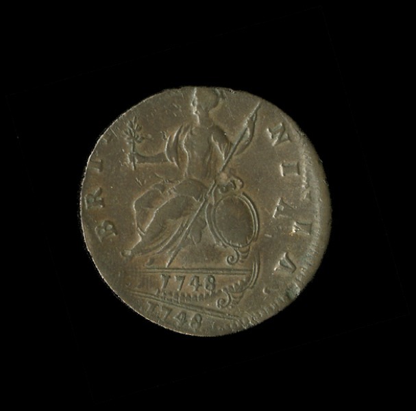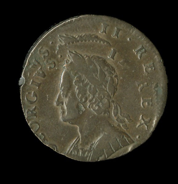 Great Britain. George II (1727-1760). Halfpenny, 1748. Double struck, with second strike 15% off center. Two dates. Old laureate and cuirassed bust l., rev. Britannia seated l. S.3719, KM 579.2. Metal gouge on cheek, shallow reverse center dip, edge flaw. About Very Fine.