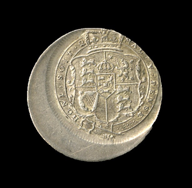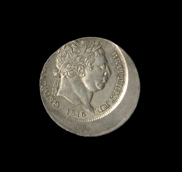 Great Britain. George III (1760-1820). Shilling, 1816. Off Center, 20%. Laureate, short-haired head r., rev. Crowned Arms in Garter. S.3790, KM 666. Some friction hairlines on George's cheek. Extremely Fine.