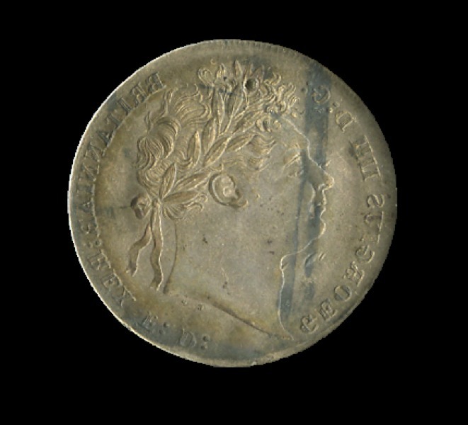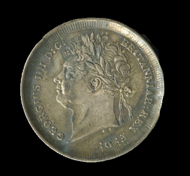Great Britain. George IV (1820-1830). Shilling, (1821-1825). Full Obverse Brockage. Laureate head l. S.3810, 3811; KM 679, 687. The mint error has produced additionally a somewhat broadstrike. Lavender gray with a cobalt-blue undertone over a few light pinscratches, dimple on chin. Good Extremely Fine.