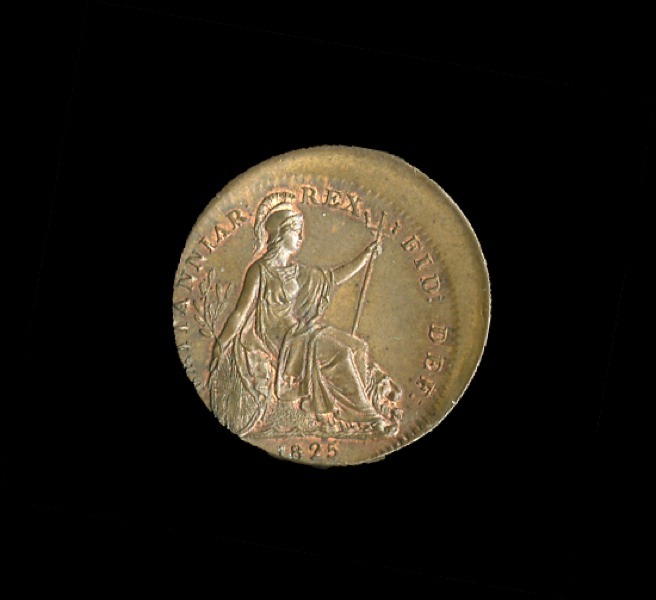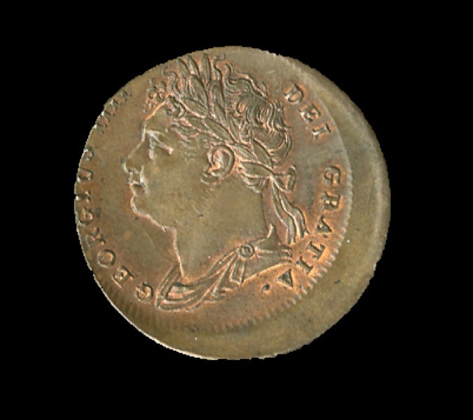 Great Britain. George IV (1820-1830). Farthing, 1825. Off Center, 20%. Laureate, draped bust l., rev. Britannia seated r. S.3822, KM 677. Light brown with orange highlights. Uncirculated.