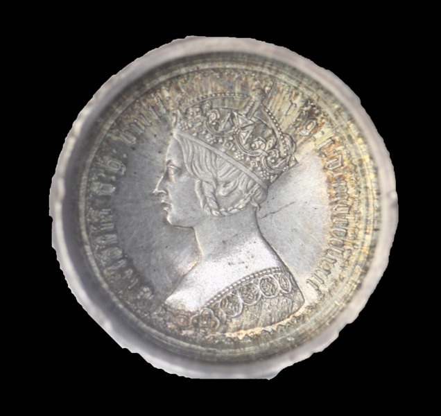 Victoria (1837-1901). "Gothic" Florin, 1872. Die Cap. Obverse inset "a la deep-dish" within raised cap of 6+mm. Gothic-style bust l. and legend, rev. Gothic cruciform cross - shallow and "stretched" from striking error; the legends neatly flowing around curved edge of the raised cap walls. S.3893, KM 746.2. A die cap occurs when a coin in the minting process sticks to the die through many strikes. As a result the metal flows up around the die with the coin taking on the shape of a bottle cap. They are among the most colorful and desirable of mint errors, and the coin here is an exceptional example. It is hard to imagine how such a notable error could have escaped the Royal Mint. The most probable explanation would be that it was kept as a souvenir by a mint official or foreman. Some obverse hairlines. Pearly silver with soft russet highlights. Uncirculated. Exceedingly Rare and possibly unique.