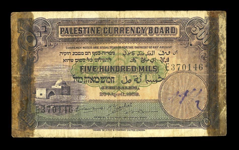 Palestine. British Administration. Palestine Currency Board. 500 Mils. 1939. P-6c. Purple on green underprint. Rachel's tomb lower left, Citadel of Jerusalem ("Tower of David") back center. Fine details, heavy tape residue left and right end panels, inked number lower right.