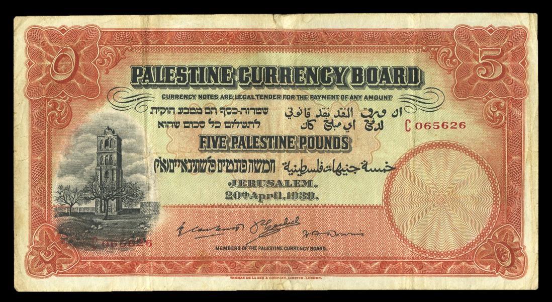 Palestine. British Administration. Palestine Currency Board. 5 Pounds. 1939. P-8c. Red and black. Crusader's Tower at Ramleh at left; Citadel of Jerusalem ("Tower of David") center back. VF, small edge split and minor stains in the margins.