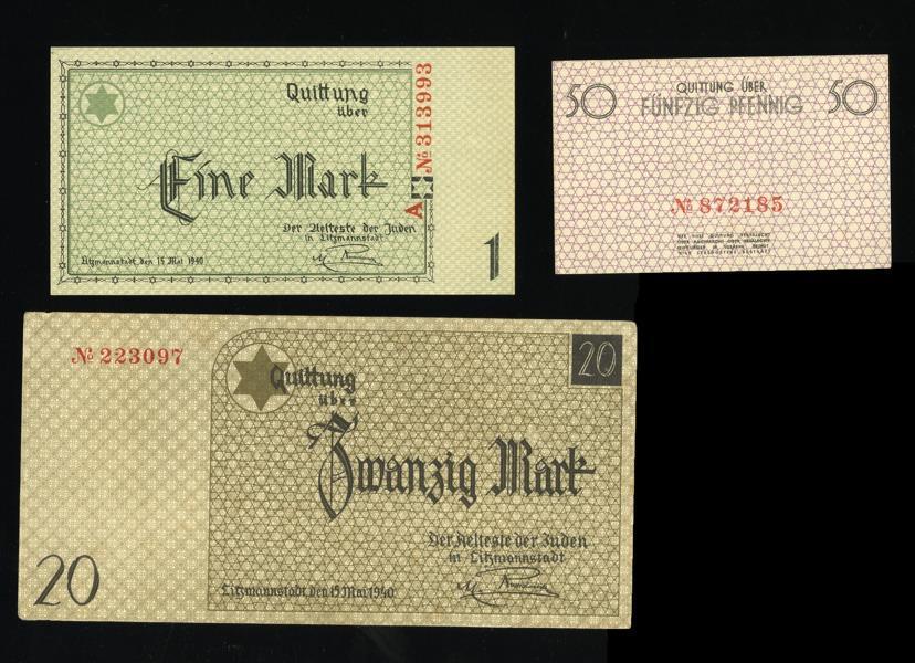 Poland. Litzmannstadt (Lodz). Ghetto. Trio: 50 Pfennig, 1 Mark, and 20 Mark. S&B 1001, 1002, 1006. Star of David and menorah. The first two Uncirculated, the latter EF with light stain back blank margin. [3]