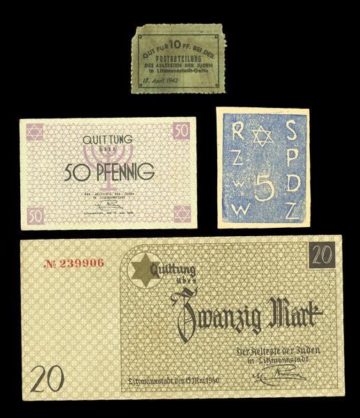 Poland. Small lot of Ghetto issues: Litzmannstadt (Lodz) Ghetto. 50 Pfennig and 20 Mark. 1940. S/B.1001, 1006a. Menorah and Star of David. Uncirculated; Post Office Chit for 10 Pfennig. 17 April 1942. Campbell 4211.c. Perforated edges. Missing top tips, Very Fine; Warsaw Ghetto. 5 Groszy. S/B.1031. Blue. Star of David above numeral "5" at center. An enigmatic issue printed on hand engraved linoleum blocks whose authenticity has been controversial. VF+. [4]