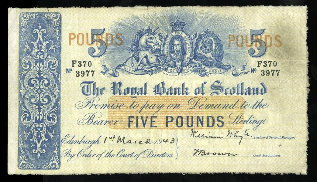 Scotland. Royal Bank of Scotland. 5 Pounds. 1943. P-317c. Signatures: Whyte - Brown. Blue and orange-brown. Crowned cameo flanked by unicorn and lion upper center. About EF, but repaired tear upper back left and some soiling upper right.
